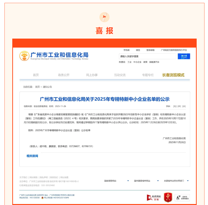 近日,广州市工业和信息化局正式公示2025年专精特新中小企业名单,视景医疗凭借在眼科数字疗法领域的深耕积淀、核心技术突破与优质产业服务,连续入选广东省“专精特新”企业名单!这一荣誉不仅是政府部门对企业专业化、精细化、特色化、创新型发展路径的权威认可,更是对公司深耕视觉健康赛道、以科技赋能医疗进步的高度肯定。