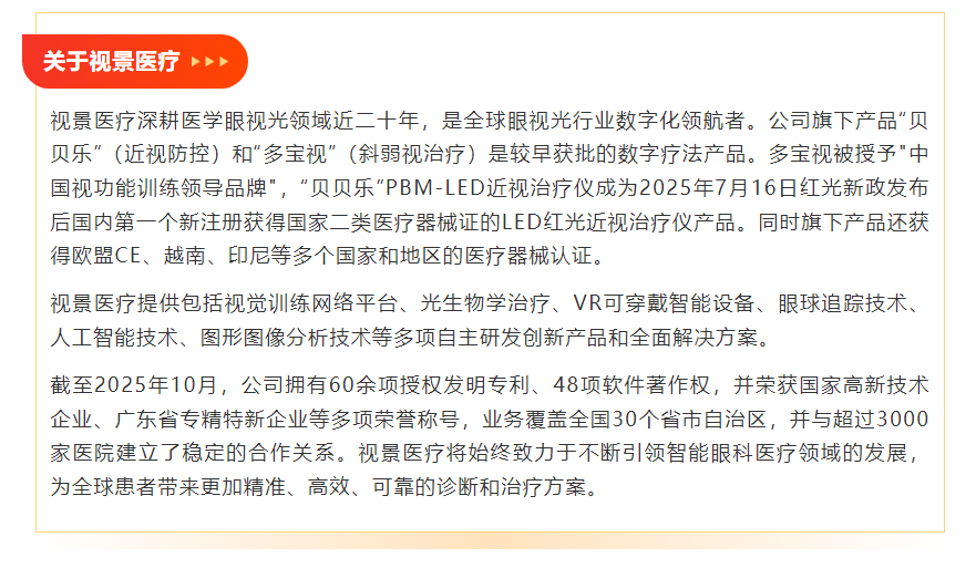 未来,视景医疗将以此次入选“专精特新”企业为契机,持续加大研发投入,深耕眼科数字疗法核心技术攻关,完善眼健康产业生态智能服务矩阵,赋能医疗机构、设备商等多方协同共创。同时,依托“专精特新”企业的政策支持与发展优势,进一步拓展技术应用场景,提升产品核心竞争力,在视觉健康数字化、智能化的道路上稳步前行,为健康中国建设贡献更多创新力量!