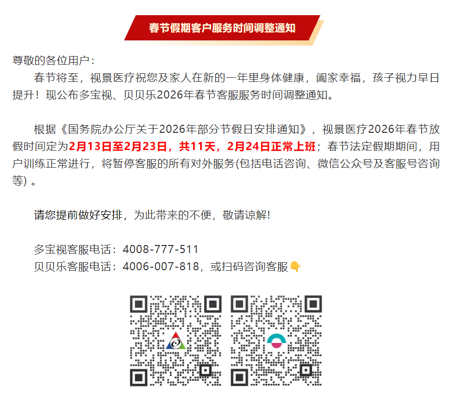 多宝视、贝贝乐2026年春节客服服务时间调整通知