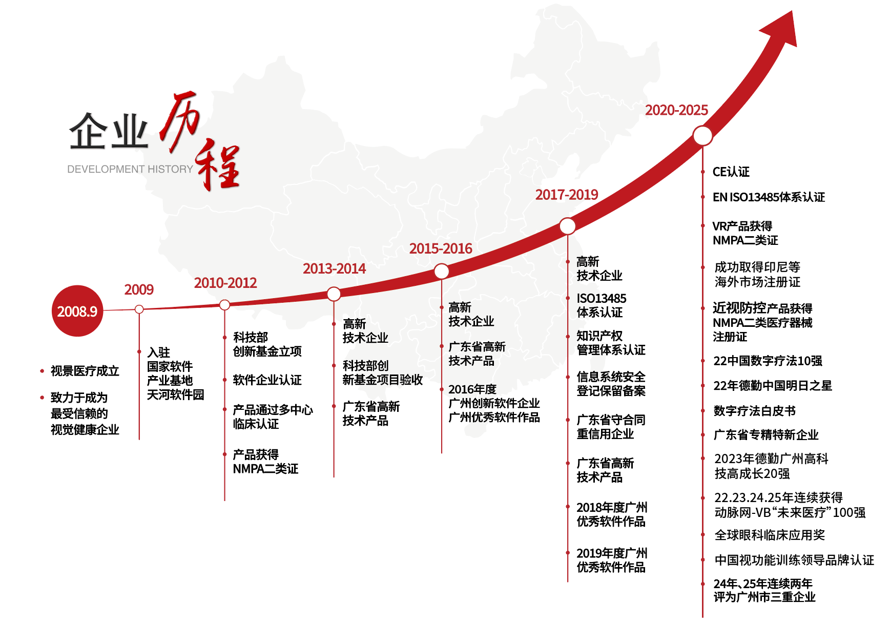 广州视景医疗软件有限公司(简称“视景医疗”)是国内领先的数字眼科领域数字科技公司,旗下拥有儿童青少年斜弱视治疗的“多宝视”及近视防控的“贝贝乐”等创新解决方案,包括视觉训练网络医疗平台、VR可穿戴智能设备、眼球追踪技术、AI视力筛查系统、AI智能方案制订系统等多项自主研发产品。公司先后通过国家科技部、广州市科信局、天河区科信局科技项目立项及验收,并连续9年维持国家高新技术企业资质。公司获得了国家二类医疗器械注册证,先后通过了CE认证、ISO13485体系认证(TUV南德)、知识产权管理体系认证、信息系统安全等级保护备案等。